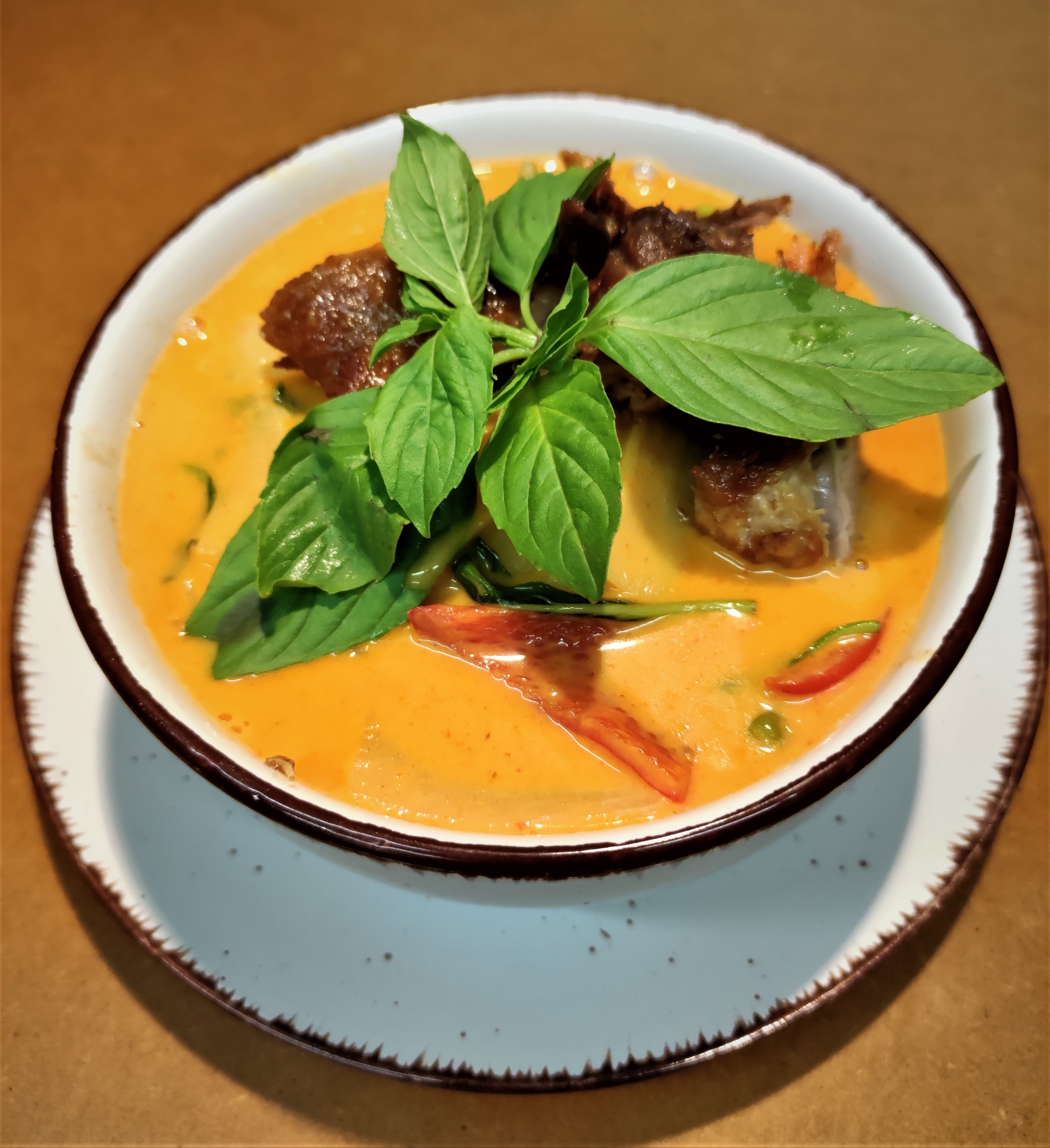 Der Klassiker Rotes Curry mit Basilikum (Horopa) Bambuss und Thai Auberginen.