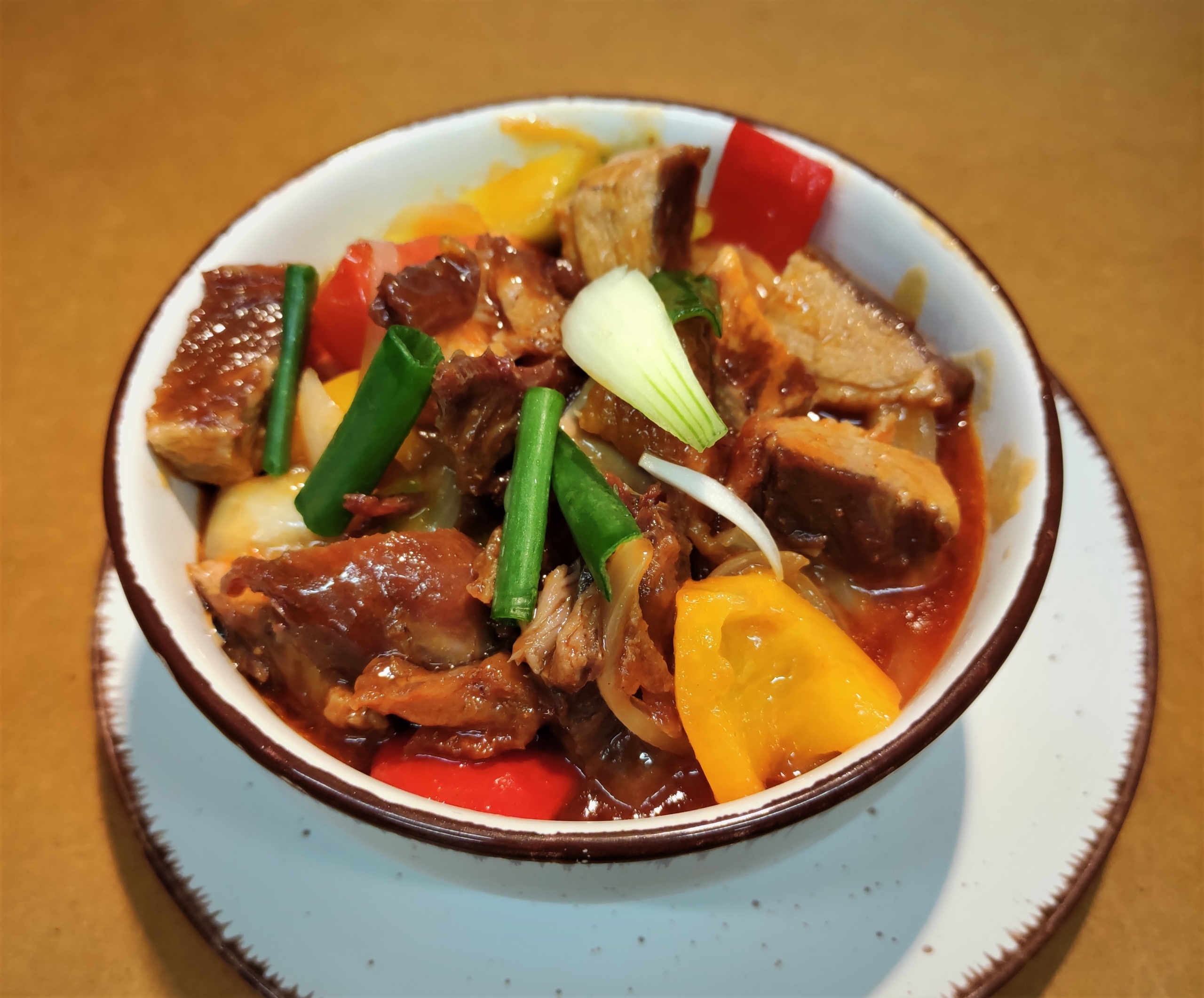 Mit Peperoni, Tomaten, Ananas und Frühlingszwiebeln. Sehr beliebt.